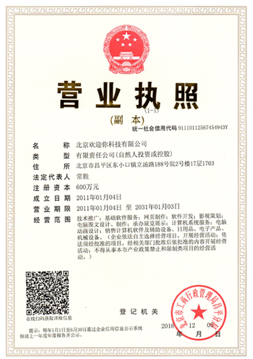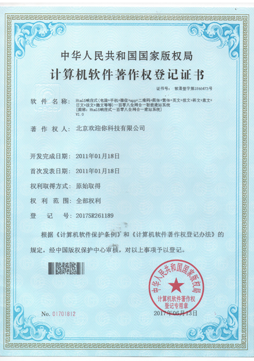 北京歡迎你科技有限公司獲得多項(xiàng)版權(quán)局"計(jì)算機(jī)軟件著作權(quán)登記證書",并已獲得“全國誠信經(jīng)營示范單位”、“全國質(zhì)量服務(wù)客戶滿意誠信企業(yè)”和“全國重合同守信用品牌企業(yè)”等榮譽(yù)稱號。